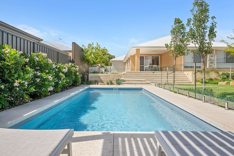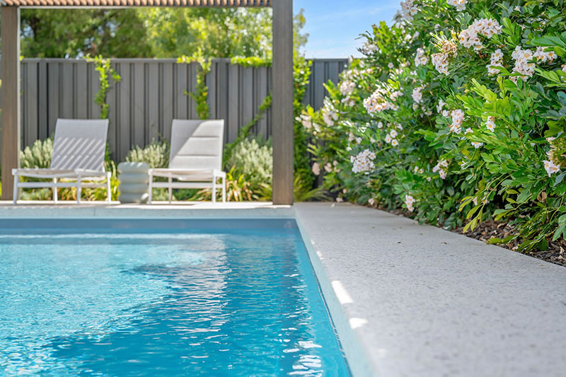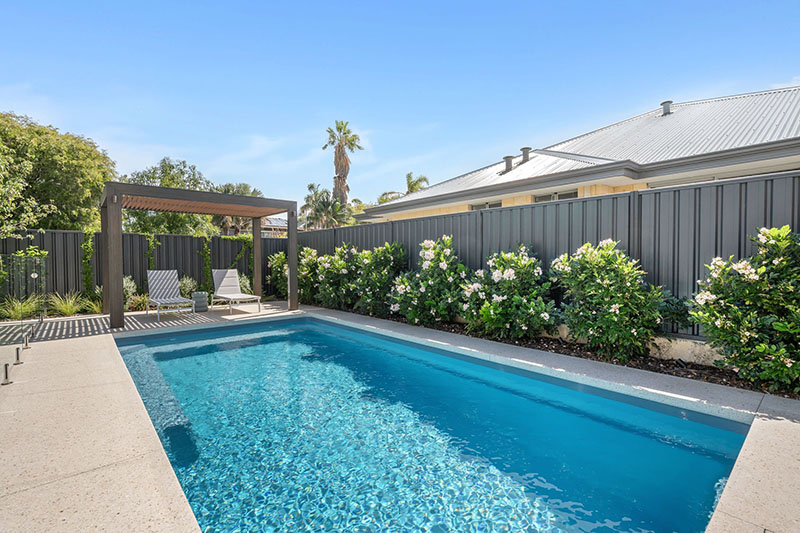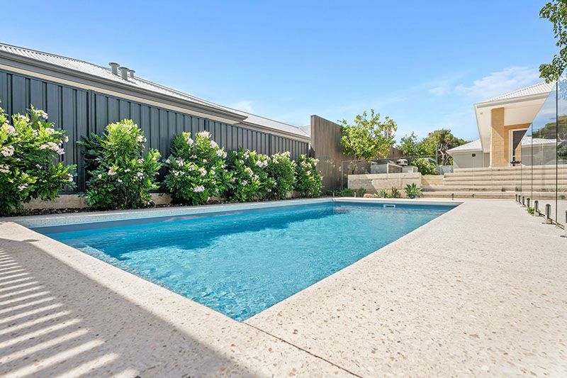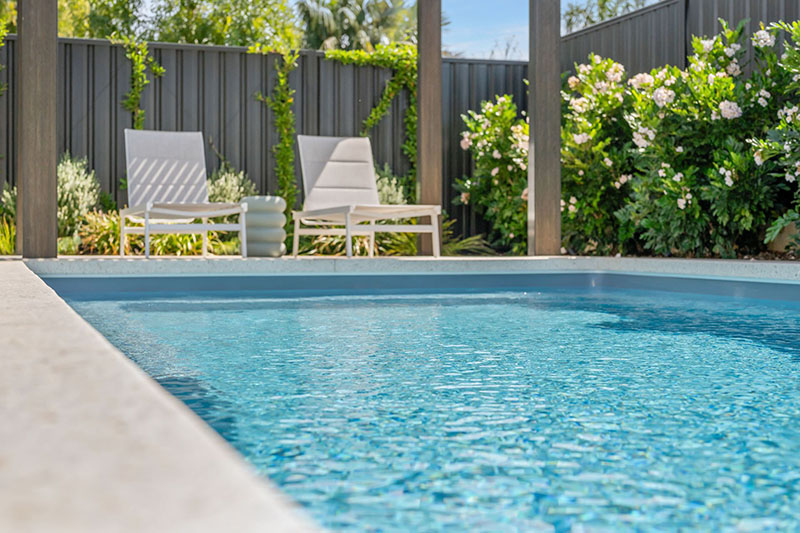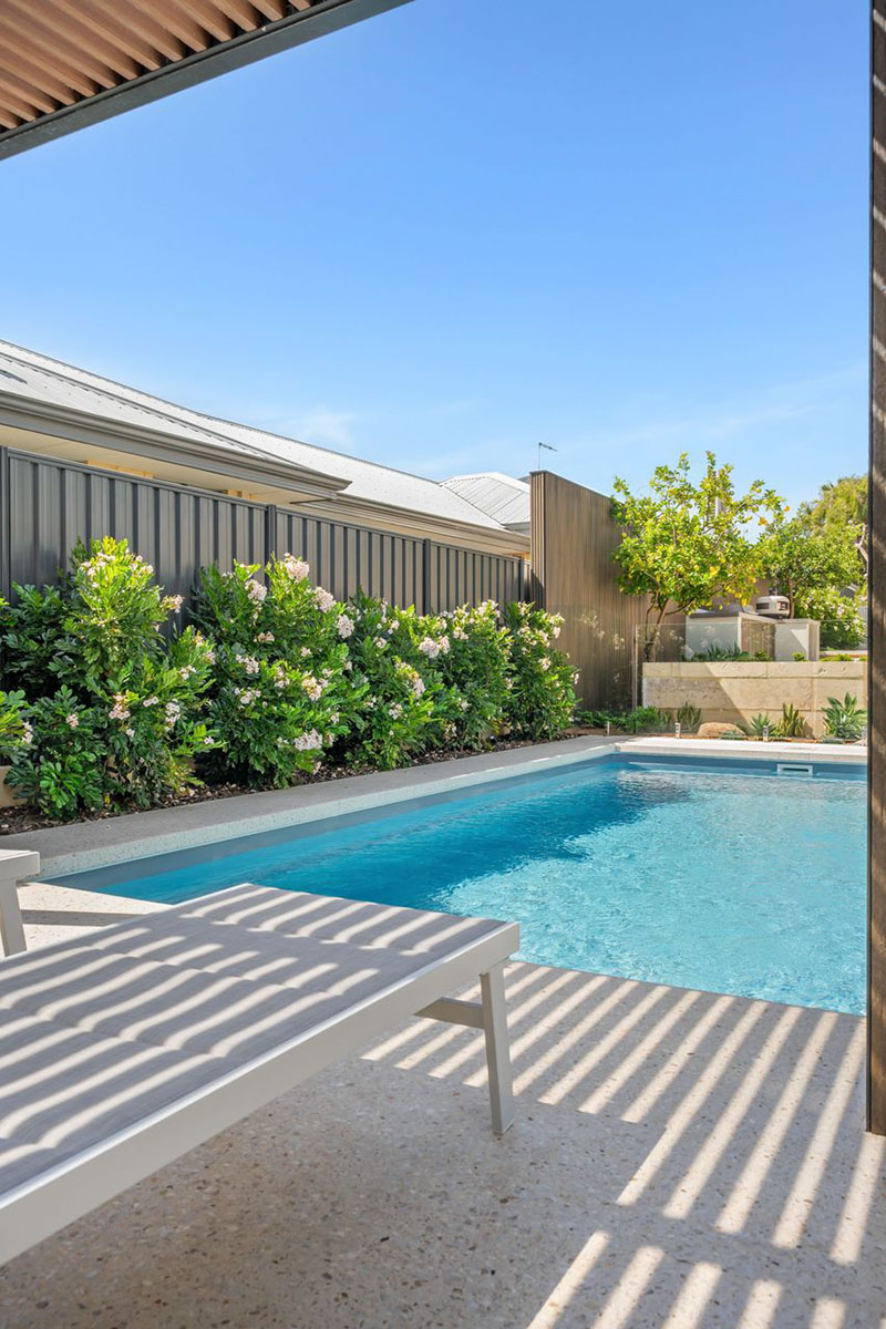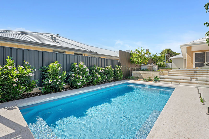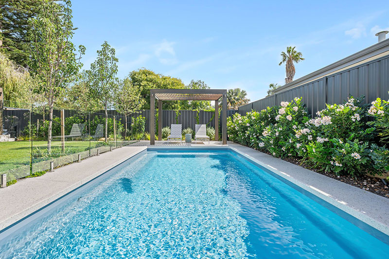 This 7.5m x 3.8m Billabong pool in Hampton Grey Shimmer brings a sleek, coastal elegance to this Safety Bay backyard. Its spacious layout offers plenty of room for swimming, relaxing, and entertaining, making it ideal for families and outdoor gatherings. The Hampton Grey Shimmer finish gives the water a cool, silvery-blue hue that beautifully reflects the natural light, complementing the laid-back coastal vibe. A stylish and functional addition, this pool is perfect for modern living by the bay.