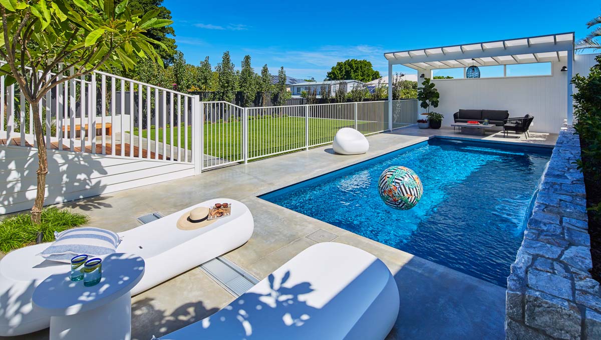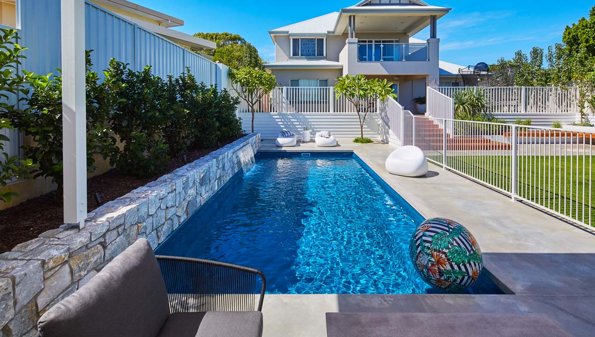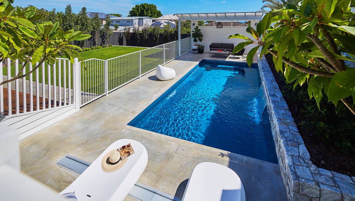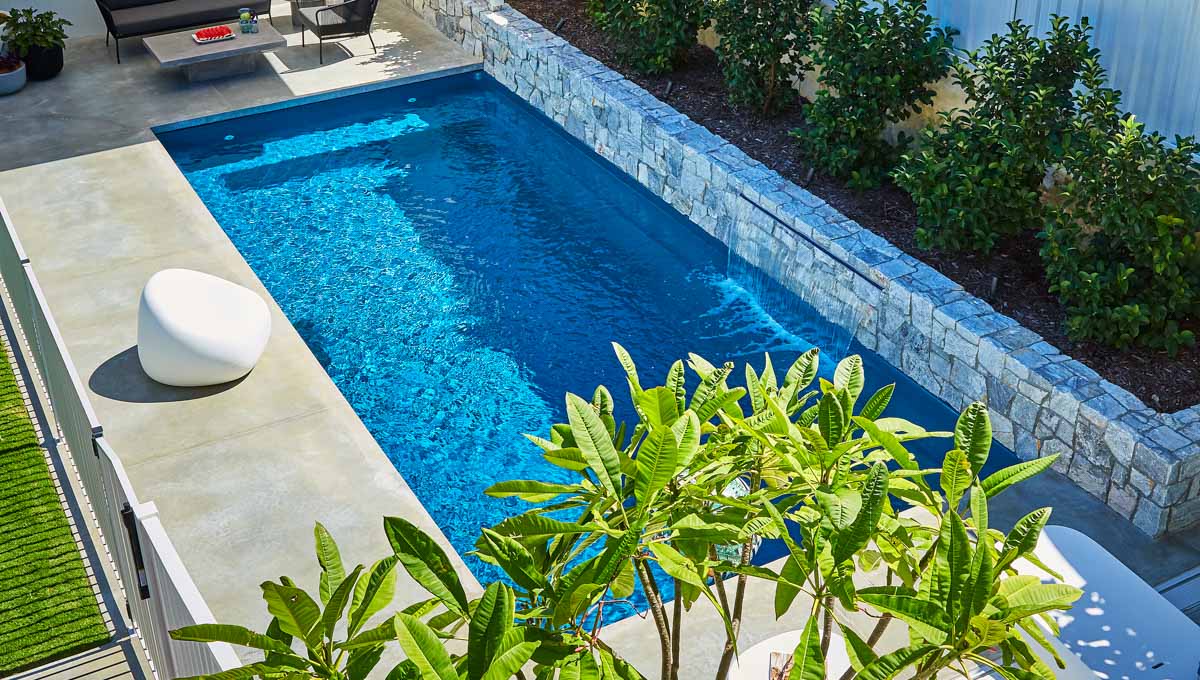 This Billabong pool installation uses a mix of contemporary elements, stone wall cladding, lighter pavers and plants to highlight the Royal Jade Shimmer pool colour. An idyllic paradise for the family, there’s no limit to how the pool space can be used. Make use of the shaded area at the back of the backyard and kick back and relax, or bask under the sun rays in the chairs on the other end. This Billabong pool is in a 8.5m x 3.8m configuration, perfect for medium to large backyards!