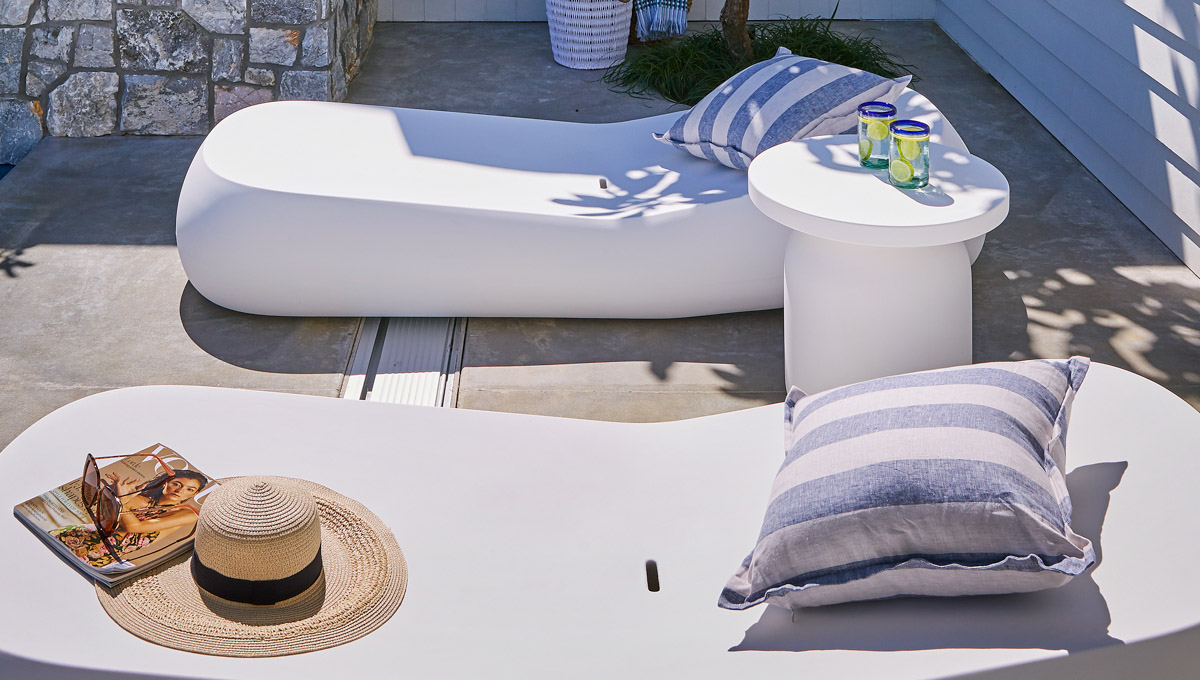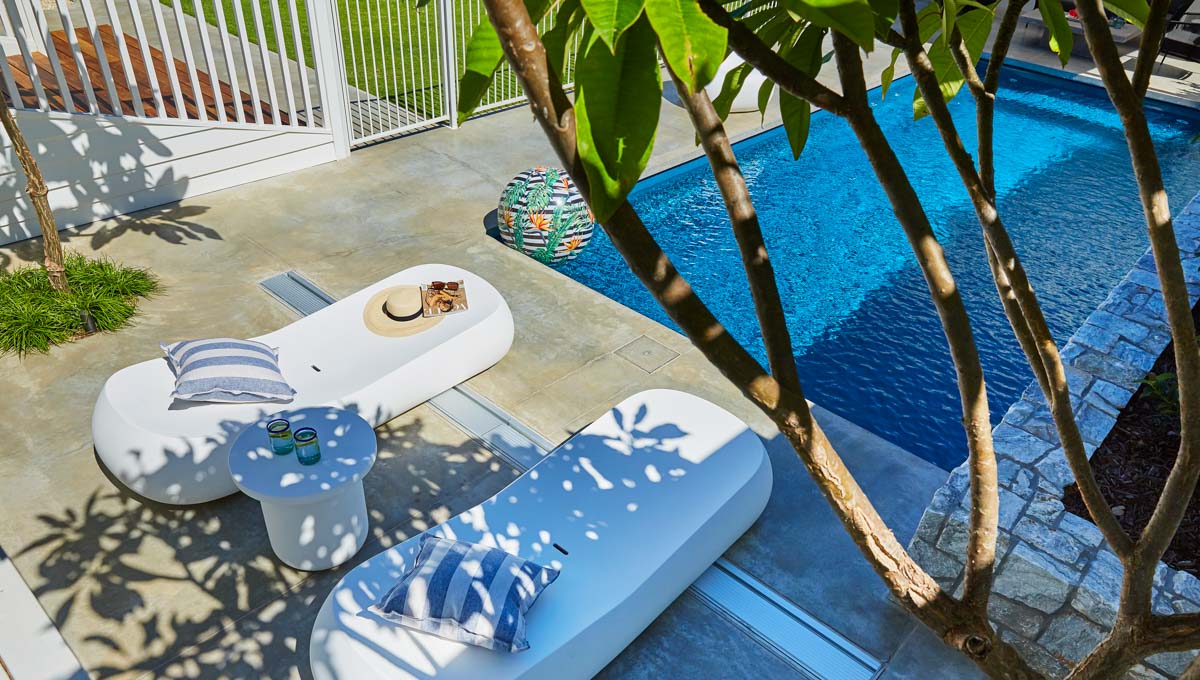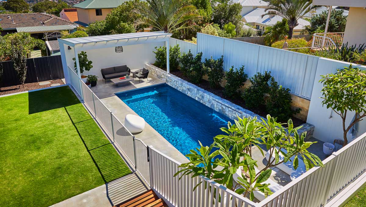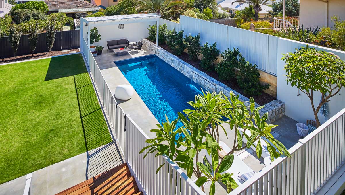This Billabong pool installation uses a mix of contemporary elements, stone wall cladding, lighter pavers and plants to highlight the Royal Jade Shimmer pool colour. An idyllic paradise for the family, there’s no limit to how the pool space can be used. Make use of the shaded area at the back of the backyard and kick back and relax, or bask under the sun rays in the chairs on the other end. This Billabong pool is in a 8.5m x 3.8m configuration, perfect for medium to large backyards!