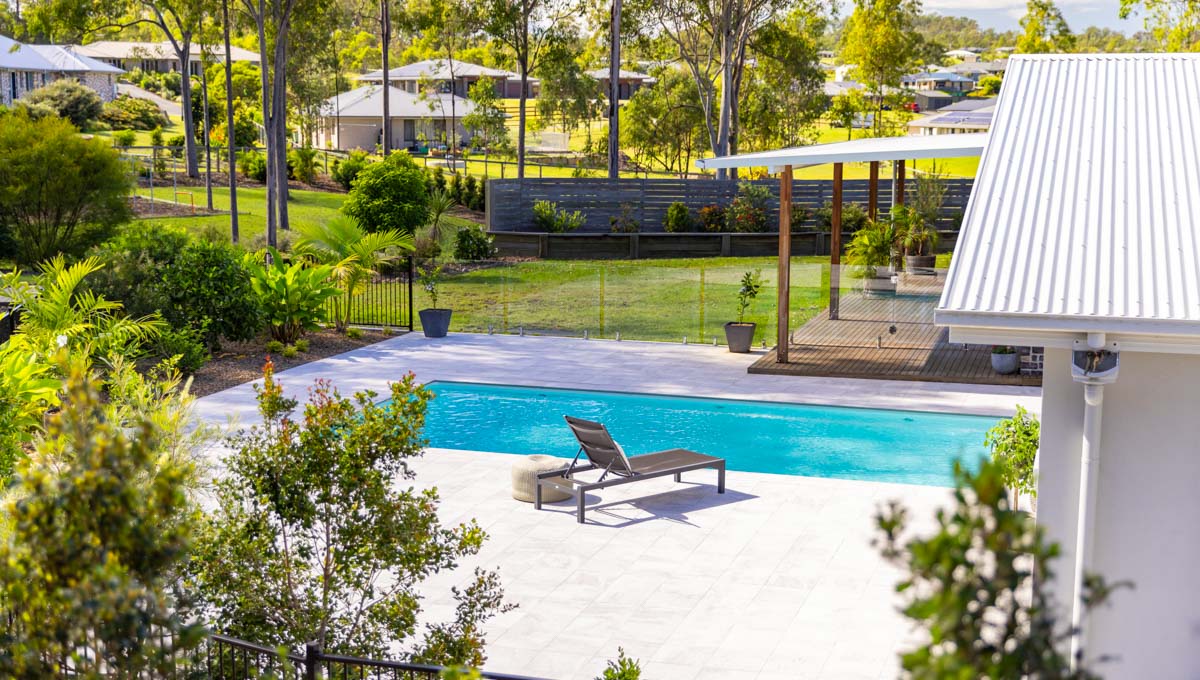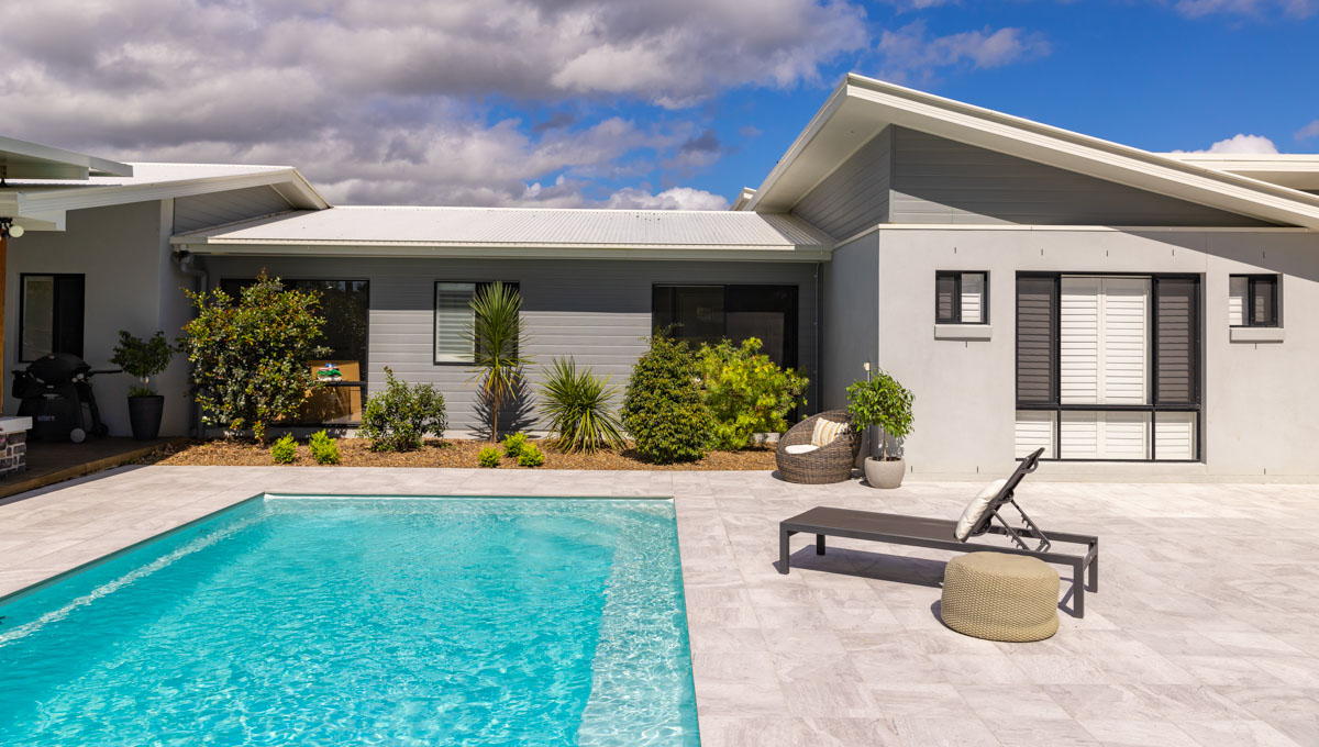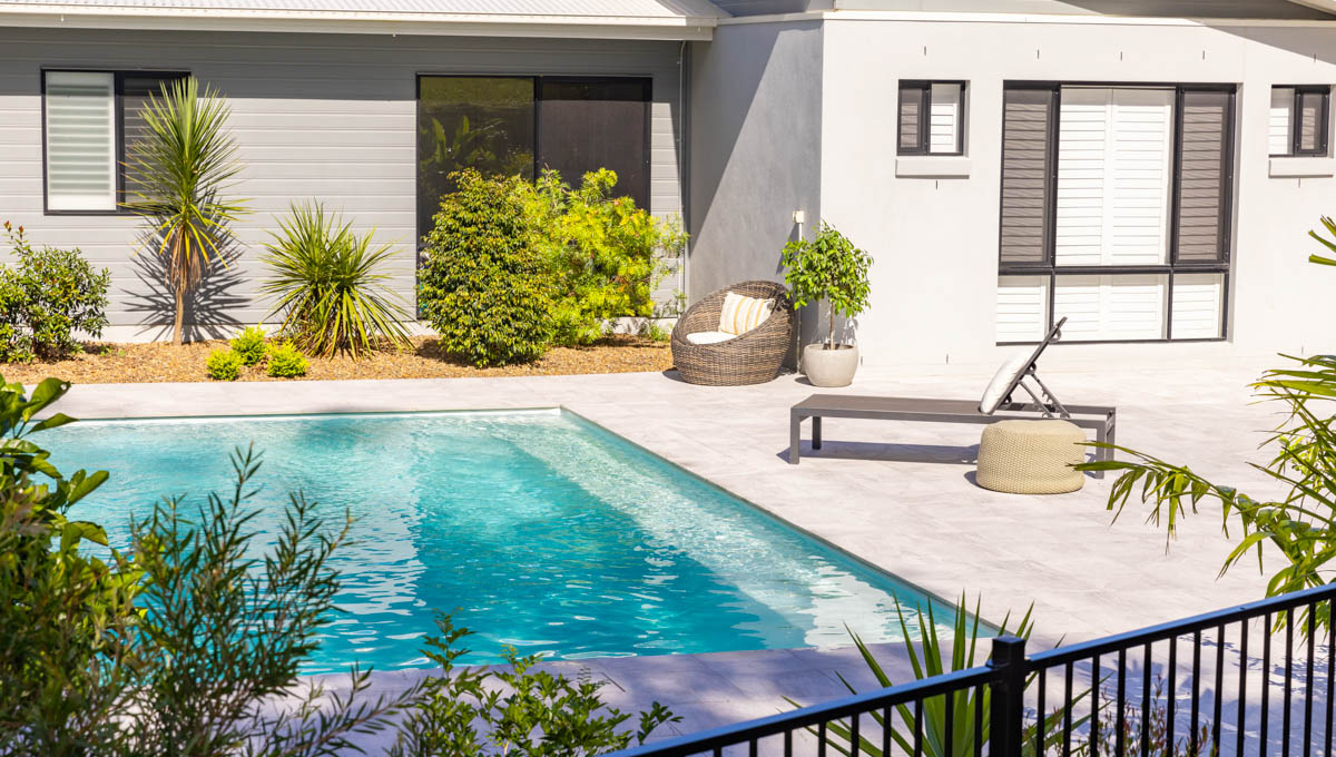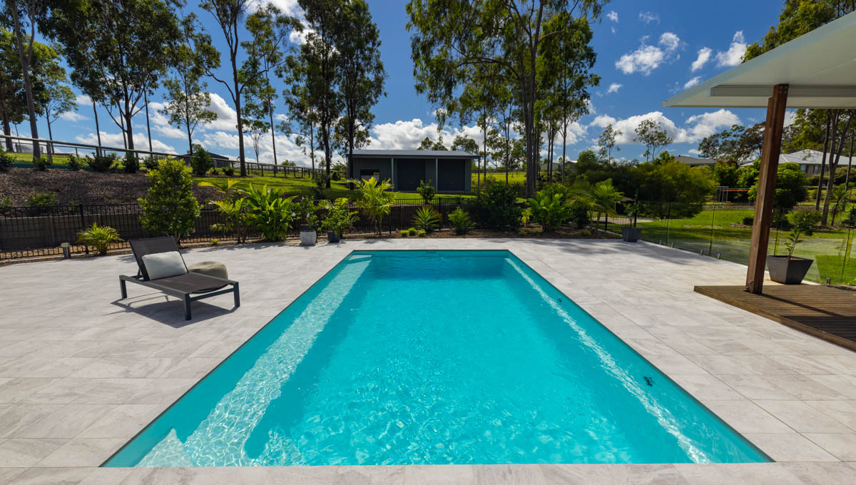 Introducing the Brampton 10.1m x 4.4m pool in Royal Alpine White Shimmer, showcasing striking geometric features that beautifully complement both modern and timeless landscapes.