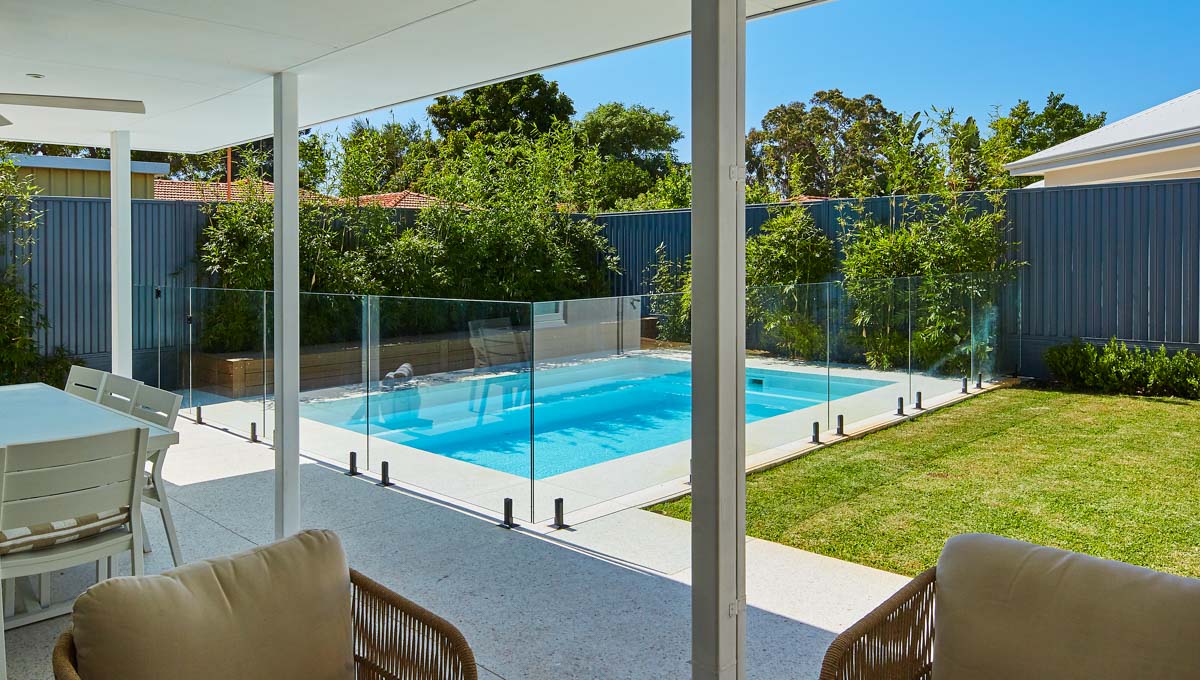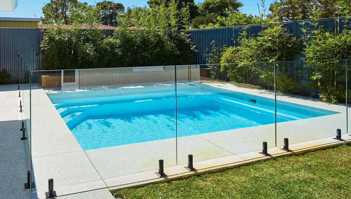 Introducing the Brampton 6.2m x 4.4m pool in Royal Alpine White Shimmer, showcasing striking geometric features that beautifully complement both modern and timeless landscapes.