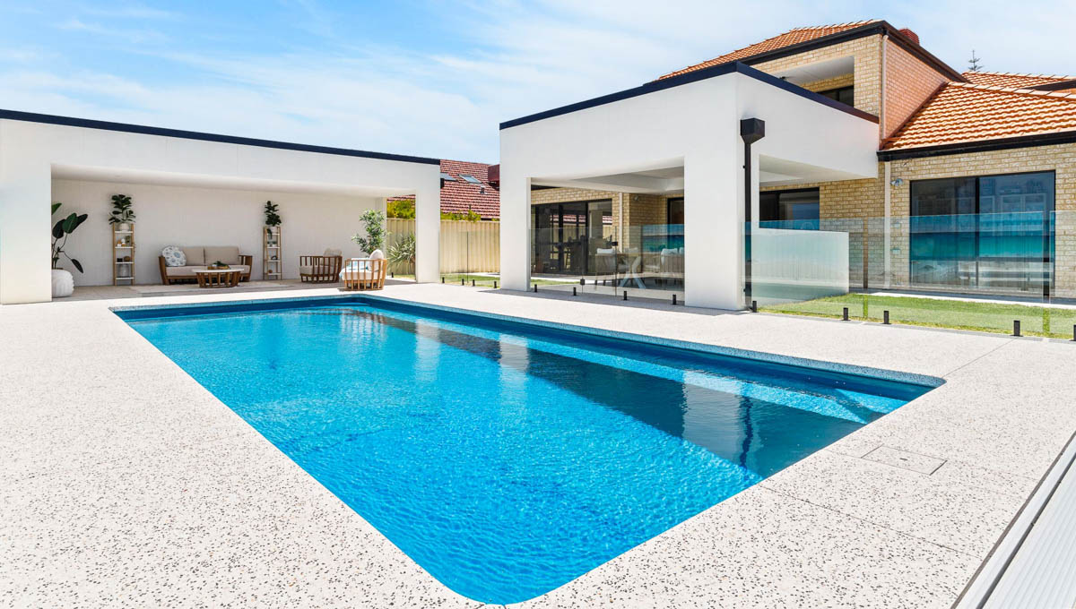 Introducing the Brampton 10.1m x 4.4m pool in Royal Ocean Shimmer, showcasing striking geometric features that beautifully complement both modern and timeless landscapes.
