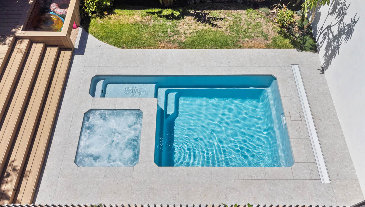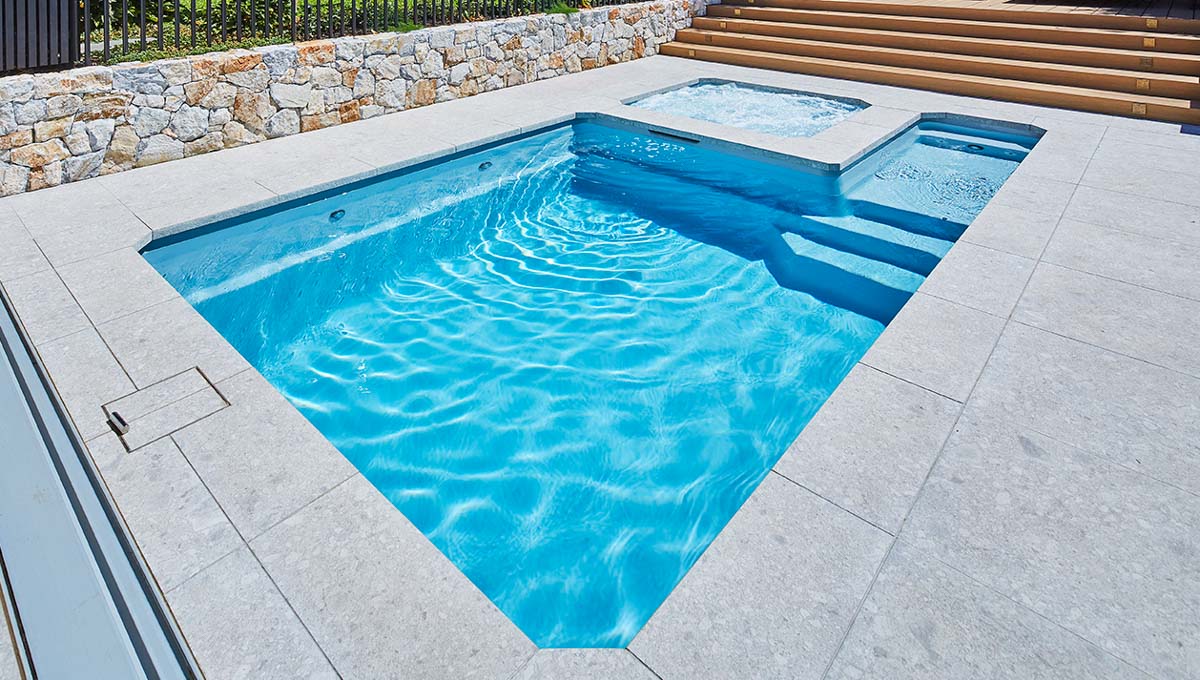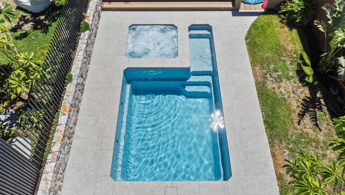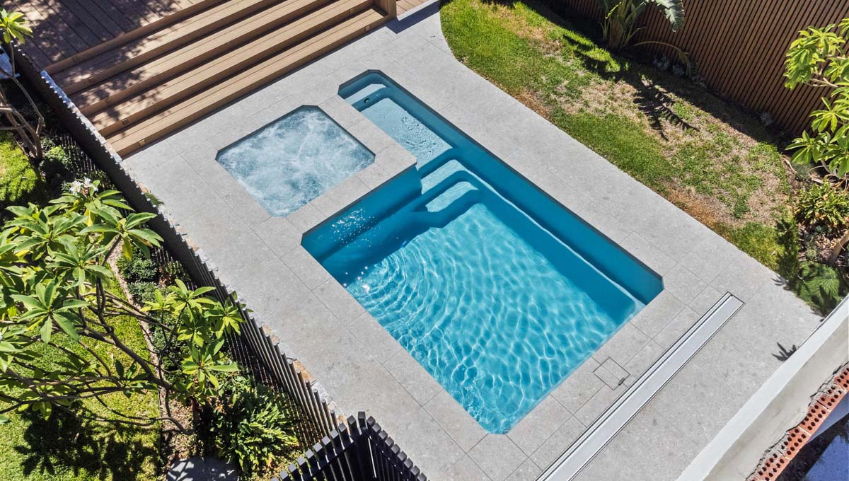 Fibreglass Pools Melbourne > Pools > Brooklyn Slimline 6.2m x 3.5m Silver Shimmer Doubleview