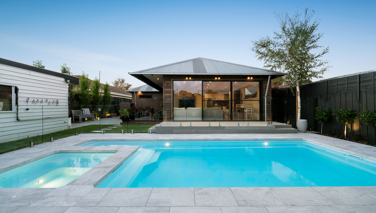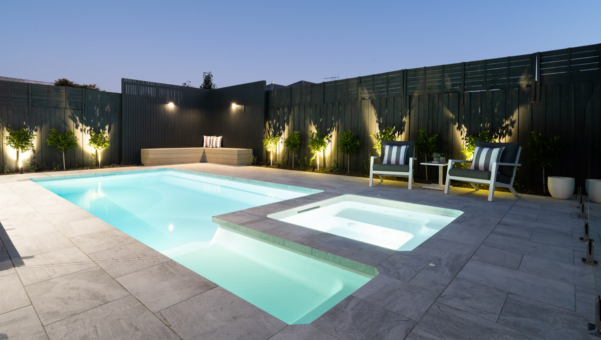 Fibreglass Pools Melbourne > Pools > Brooklyn Slimline 7.2m x 3.5m Alpine White Shimmer Evesham