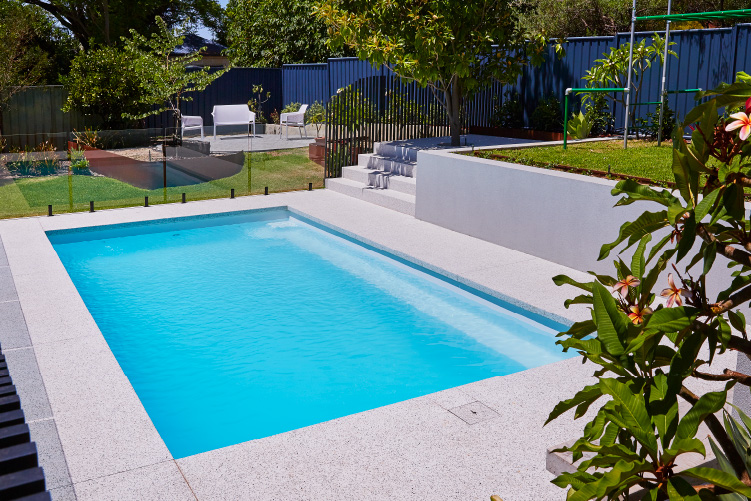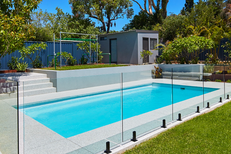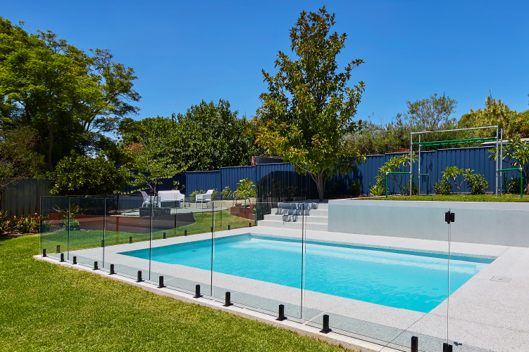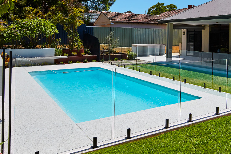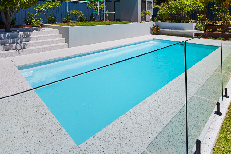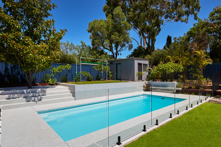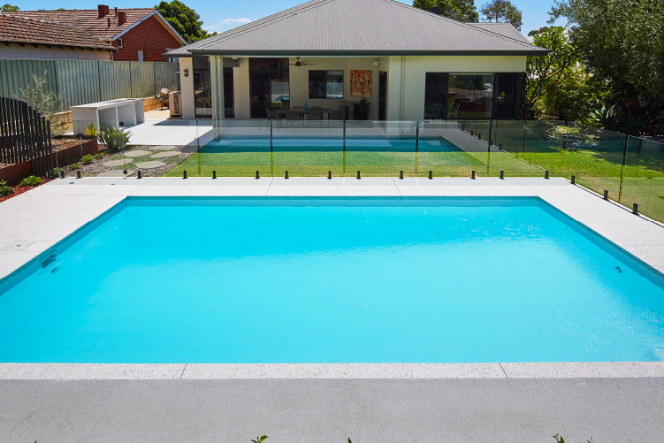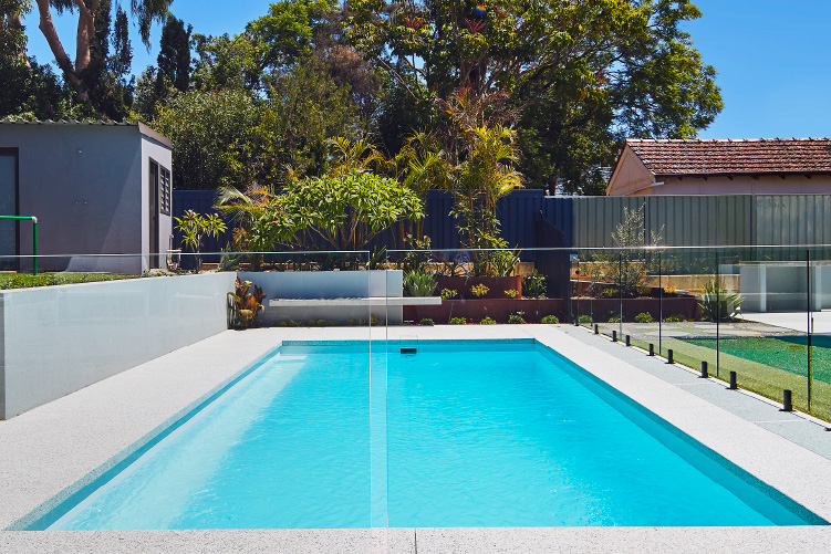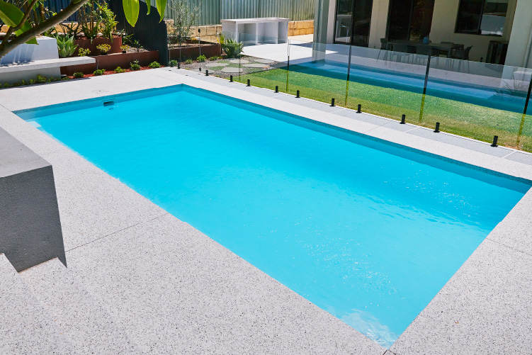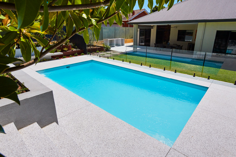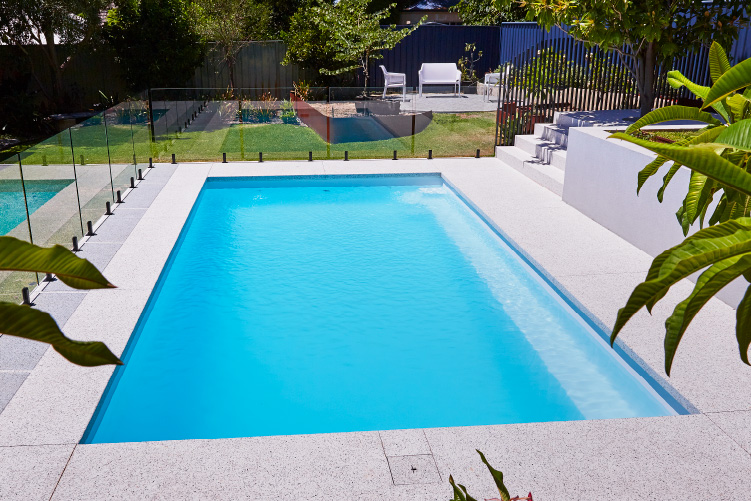 Experience the stunning beauty of our Hampton pool in the 8m x 4m configuration, showcasing the Polo White Sparkle colour. This exquisite pool is meticulously installed at the picturesque Coolbinia location, surrounded by lush greenery that offers a tranquil setting. The vibrant emerald hues of the surrounding foliage create a mesmerising contrast to the pristine white sparkle of the pool, making it a captivating addition to any backyard. Immerse yourself in a world of elegance and serenity with our Hampton pool, perfect for creating unforgettable moments with loved ones.