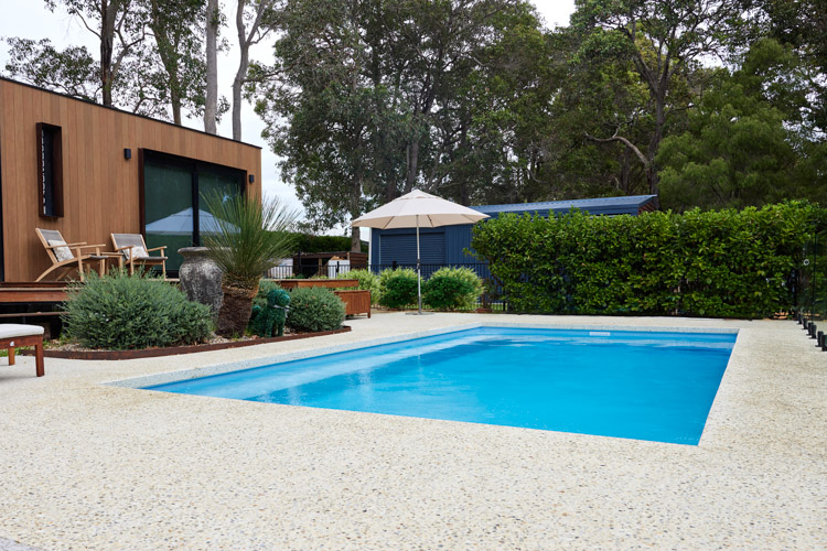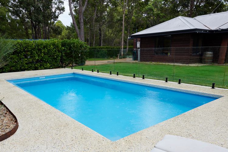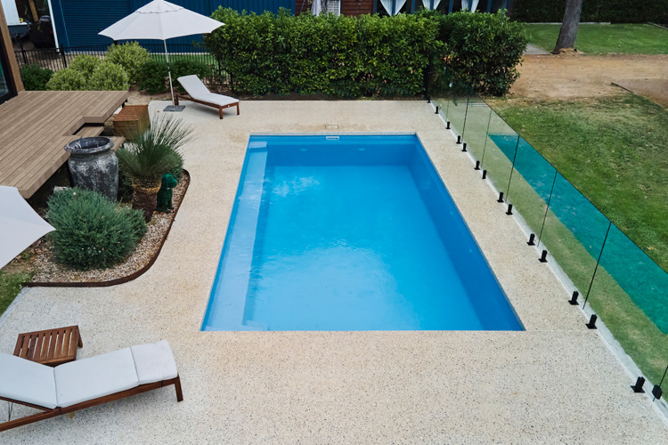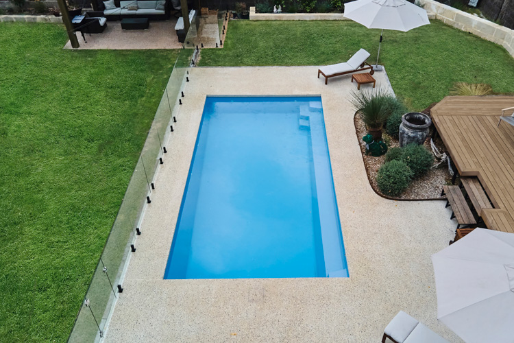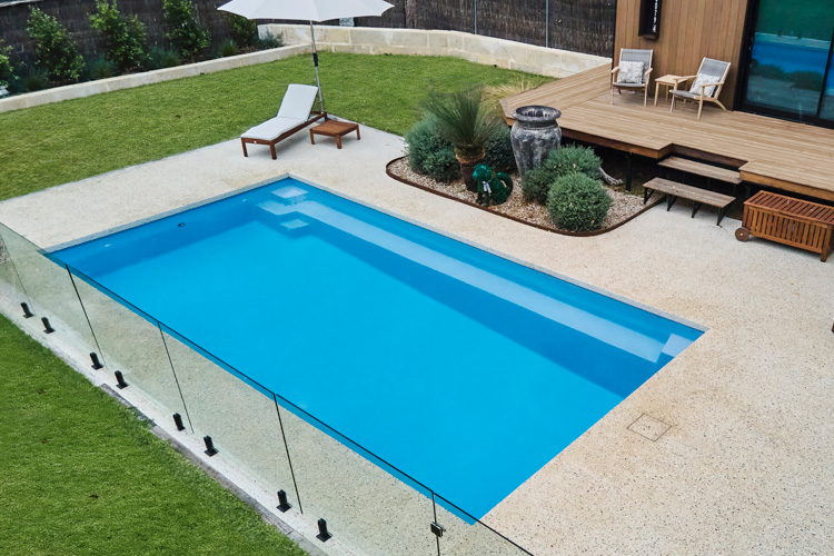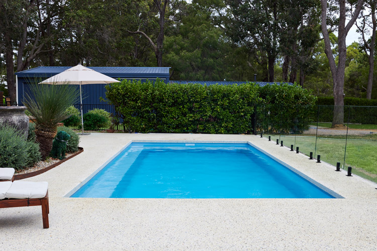 Our Hampton pool in its 8m x 4m configuration was just installed at a Bunbury home, by one of our skilled pool builder teams. This family has chosen our stunning Sky Blue Sparkle colour, which contrasts against the greenery and the pale pavers they’ve selected to surround the pool.